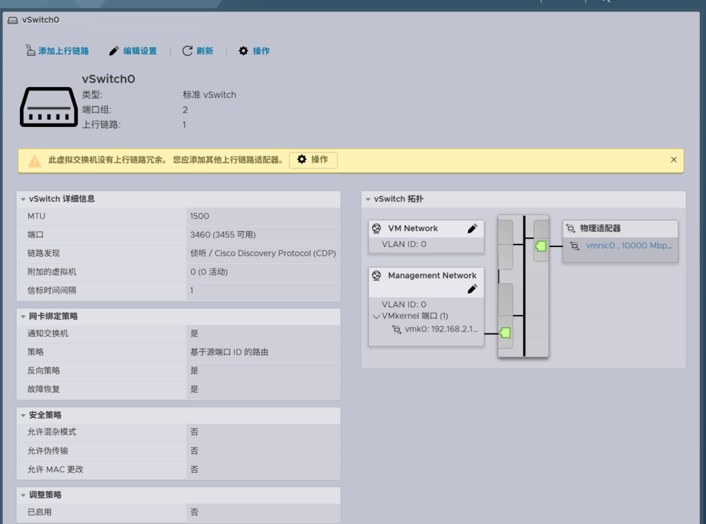 - 配置群集之前,我们要先添加相应的物理网卡,先添加4张物理网卡,为了网卡冗余,两张管理网卡,两张数据网卡,数据网卡主要用来跑存储流量,要不然会如下一直提示”此虚拟机没有上行链路冗余”。