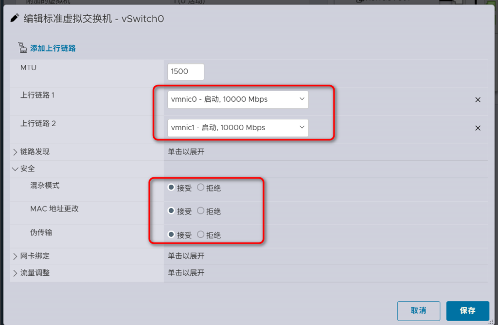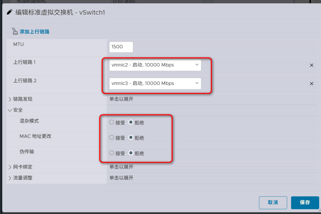 - 添加vSwitch1,此交换机用来走数据,主要是NFS和ISCSI,Vmotion这些,选择“拒绝”是因为等一下配置ISCSI网络这里配置跟普通虚拟机不一样,ISCSI不支持双活,不能两张网卡同时启用,只能一张启用,一张禁止,只要一个网络断开了,禁用的才会接管。