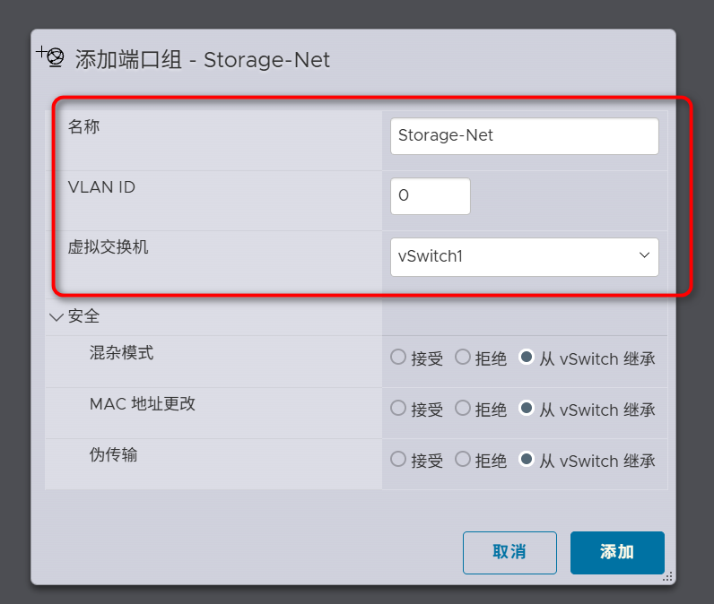 - 添加一个端口组“Storage-Net”,使其连接刚添加的vSwitch1交换机。