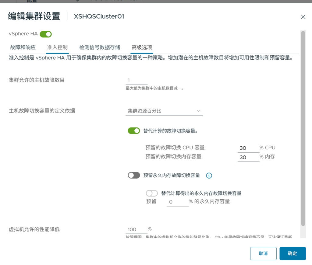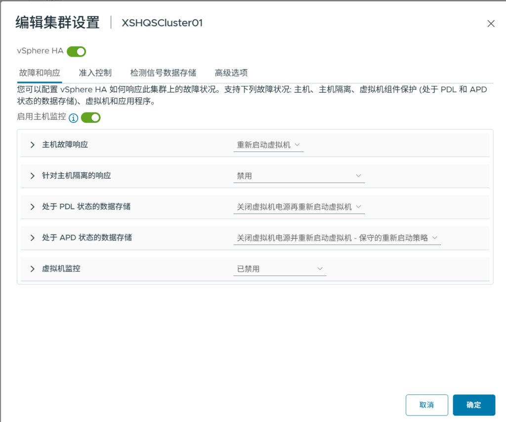 - vSphere HA的配置,可以根据具体情况和资源自行更改配置。