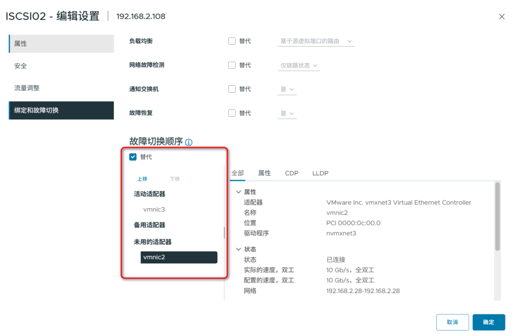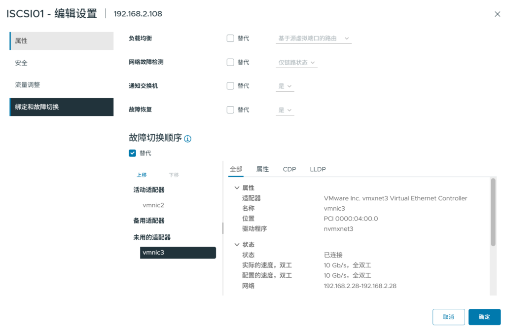 - 两个ISCSI的Failover激活网卡不能选一样,如下ISCSI01激活网卡是vmnic2.未配置的是“vmnic3”,因为ISCSI这个协议不支持双活,为了冗余要这样配置。