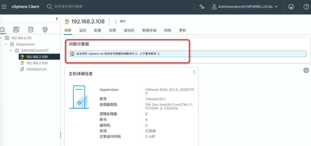 - 当我们建立集群完成后,如果存储只有一个,就会提示“该主机的 vSphere HA 检测信号数据存储数目为 0,少于要求数目: 2”,这样我们就要添加至少添加两个存储,在企业里面,一般会有NetApp或者是Dell的EMC的存储,一般会挂载NFS和ISCSI存储,我这里的实验只是使用家里的小型Synology存储。