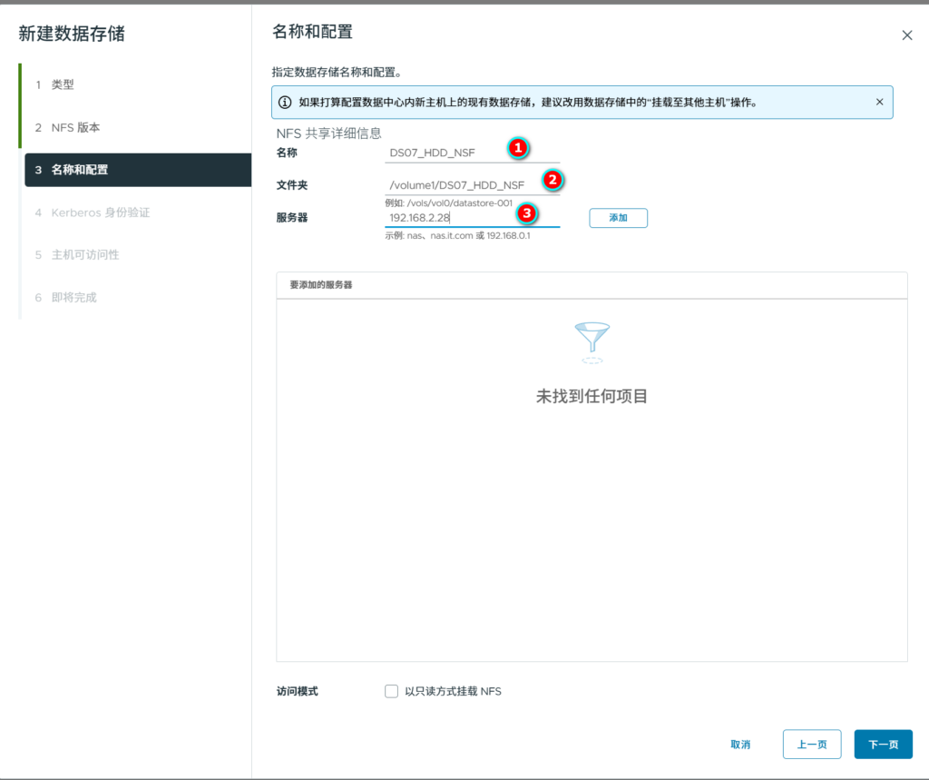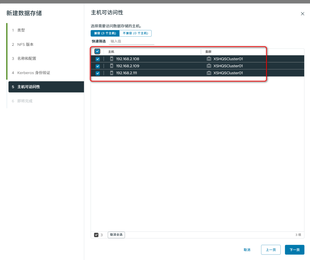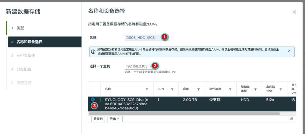 输入存储的名字,随便选择一个主机,选择刚才新扫描到的ISCSI存储。