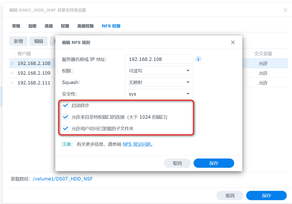 权限选择全部允许,方便挂载。