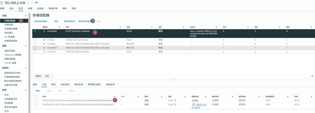 在vCenter里面已经扫描出新的ISCSI存储设备,这里只要一台ESXI设备扫描到了,其他的机器也自动发现了。因为权限是允许所有。