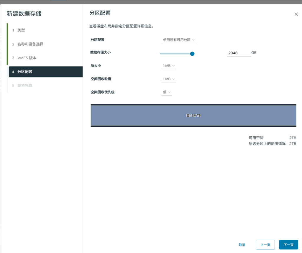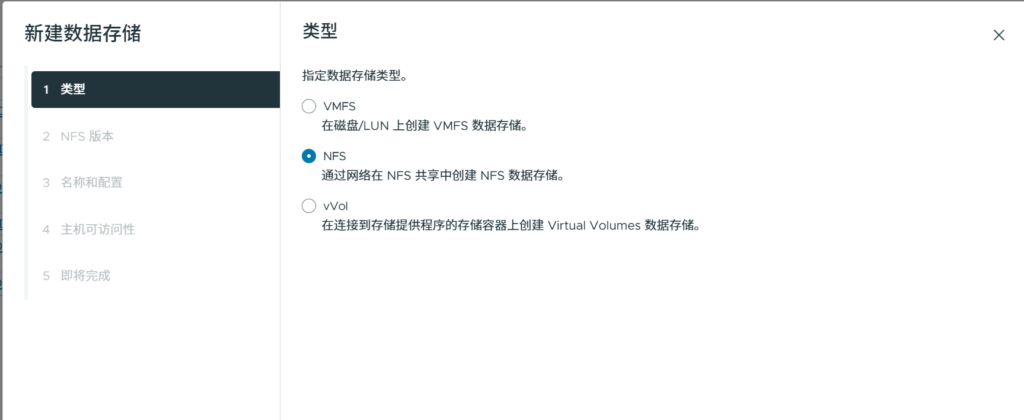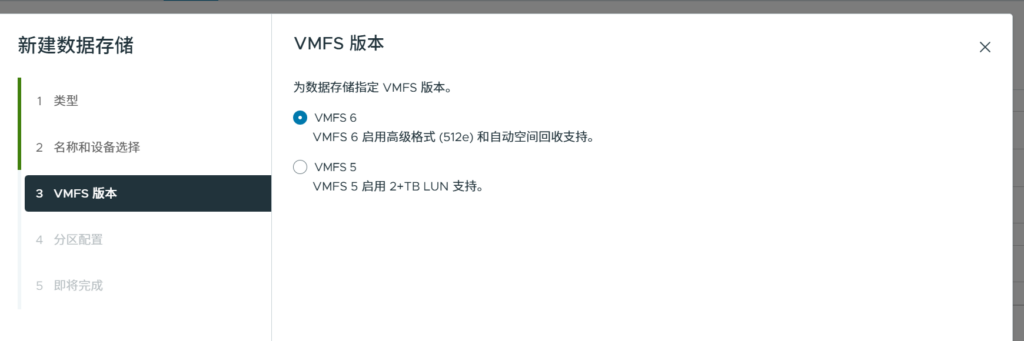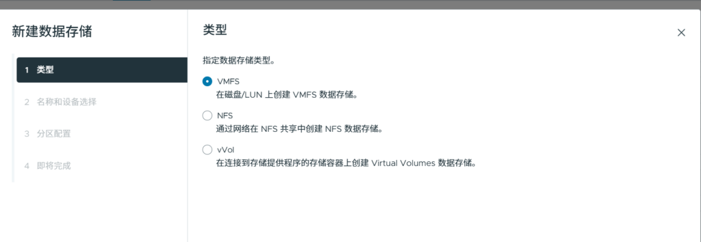 回到Cluster,新建存储,选择VMFS。