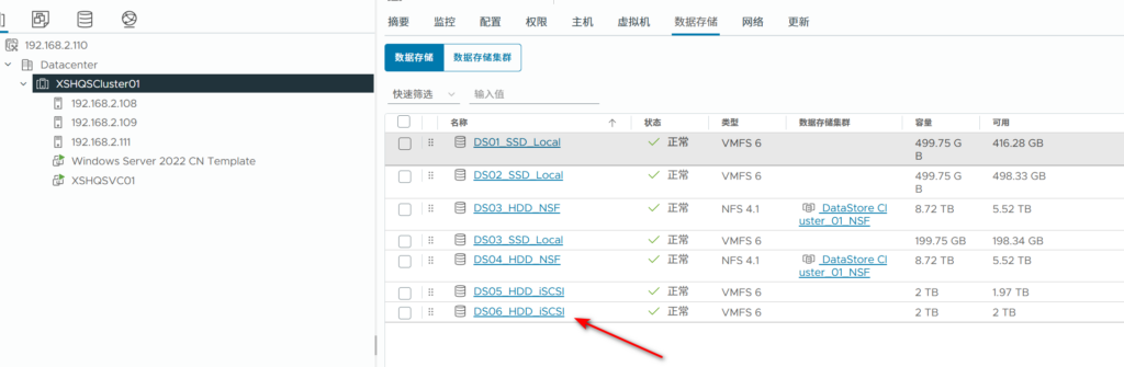 可以看到在Cluster和主机的级别都能看到这个存储,证明这个ISCSI存储是共享存储,可以用作DRS。