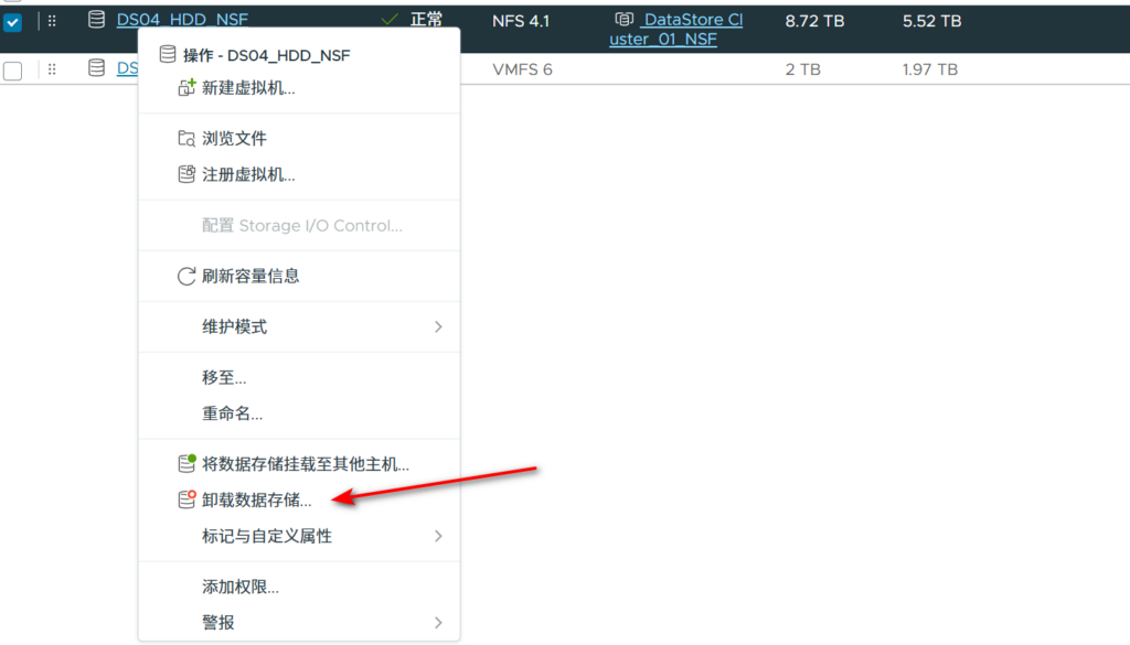 要删除NFS存储的时候直接选择卸载数据库存储